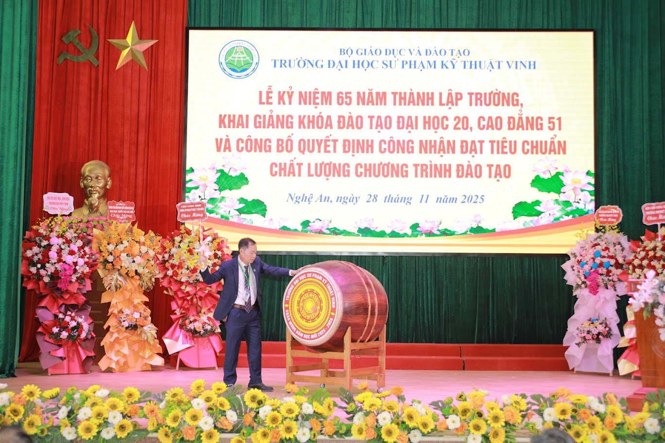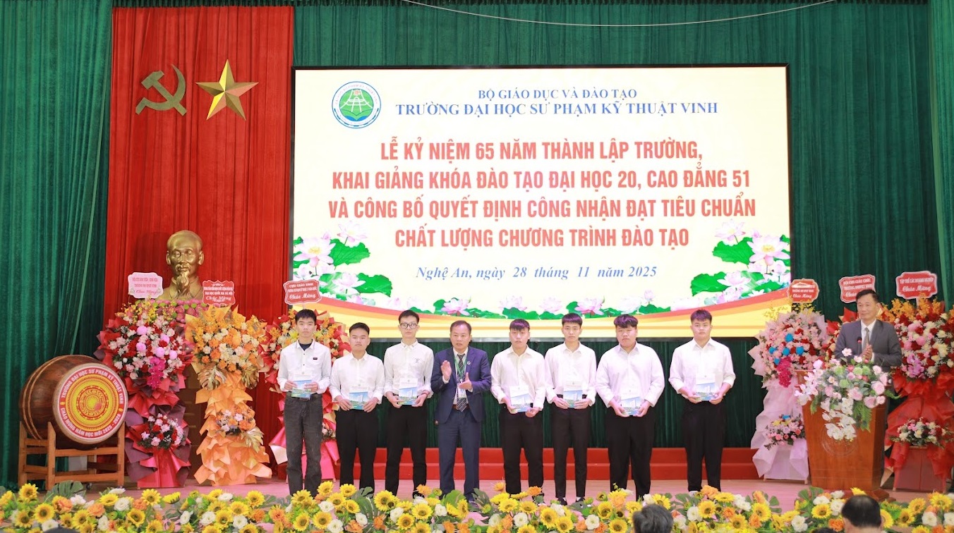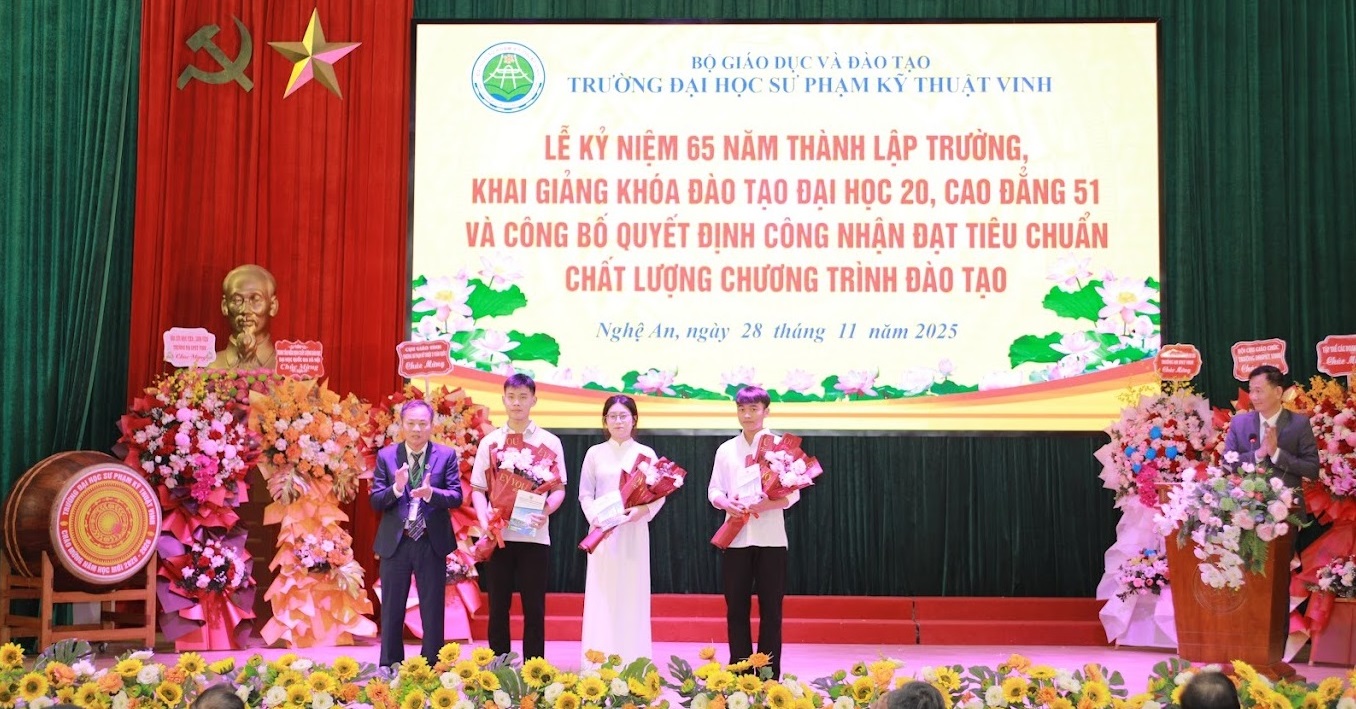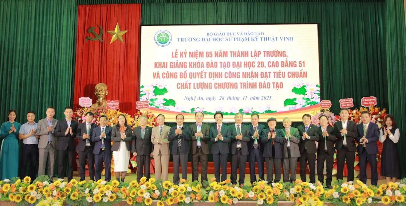 Sáng 28/11, Trường Đại học Sư phạm Kỹ thuật Vinh trang trọng tổ chức Lễ Kỷ niệm 65 năm thành lập trường, khai giảng khóa đào tạo Đại học K20, Cao đẳng K51 và công bố quyết định công nhận đạt tiêu chuẩn chất lượng chương trình đào tạo.